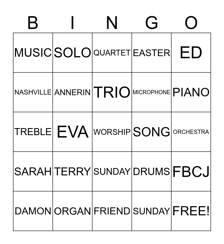 This bingo card has 33 words: FREE!, LAVON, EVA, JAMES ARRINGTON, SARAH, ANNERIN, ED, DAMON, SOLO, DUET, TRIO, QUARTET, HYMN, ANTHEM, SONG, PIANO, ORGAN, TREBLE, TERRY, DRUMS, SUNDAY, CONCERT, MUSIC, ORCHESTRA, FRIEND, WORSHIP, EASTER, MICROPHONE, NASHVILLE, FBCJ, ROBE, SUNDAY and MISSIONS.