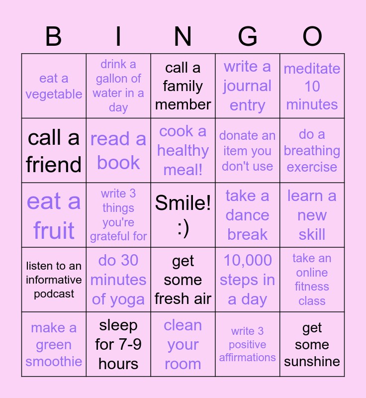 This bingo card has a free space and 24 words: do 30 minutes of yoga, sleep for 7-9 hours, cook a healthy meal!, make a green smoothie, meditate 10 minutes, eat a vegetable, call a friend, drink a gallon of water in a day, take a dance break, get some fresh air, donate an item you don't use, eat a fruit, 10,000 steps in a day, take an online fitness class, read a book, write 3 positive affirmations, learn a new skill, call a family member, do a breathing exercise, write 3 things you're grateful for, get some sunshine, listen to an informative podcast, write a journal entry and clean your room.