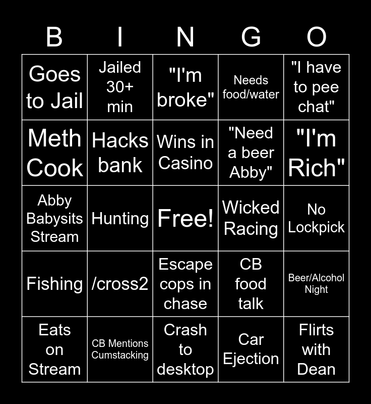 This bingo card has a free space and 35 words: Drinks Tea(any), Laptop Queue, Gets Laptop, Hacks bank, Escape cops in chase, Needs food/water, Meth Cook, Traffic Ticket, Wins in Casino, Loses in Casino, Abby Babysits Stream, "I have to pee chat", AFK misses phone call, Goes to hospital, Goes to Jail, Wicked Racing, Car Ejection, Hunting, Fishing, Flirts with Dean, CB food talk, Eats on Stream, Beer/Alcohol Night, CB Mentions Cumstacking, "I'm broke", "I'm Rich", Buddha Noises, Wrangler, "Need a beer Abby", No Lockpick, Fails Bank Hack, Crash to desktop, /cross2, Jailed 30+ min and Runs from RR to ATM.