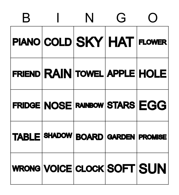 This bingo card has 25 words: SHADOW, CLOCK, TOWEL, WRONG, FLOWER, PIANO, FRIEND, COLD, STARS, BOARD, APPLE, FRIDGE, GARDEN, PROMISE, RAIN, SUN, EGG, SKY, HOLE, NOSE, RAINBOW, VOICE, TABLE, HAT and SOFT.