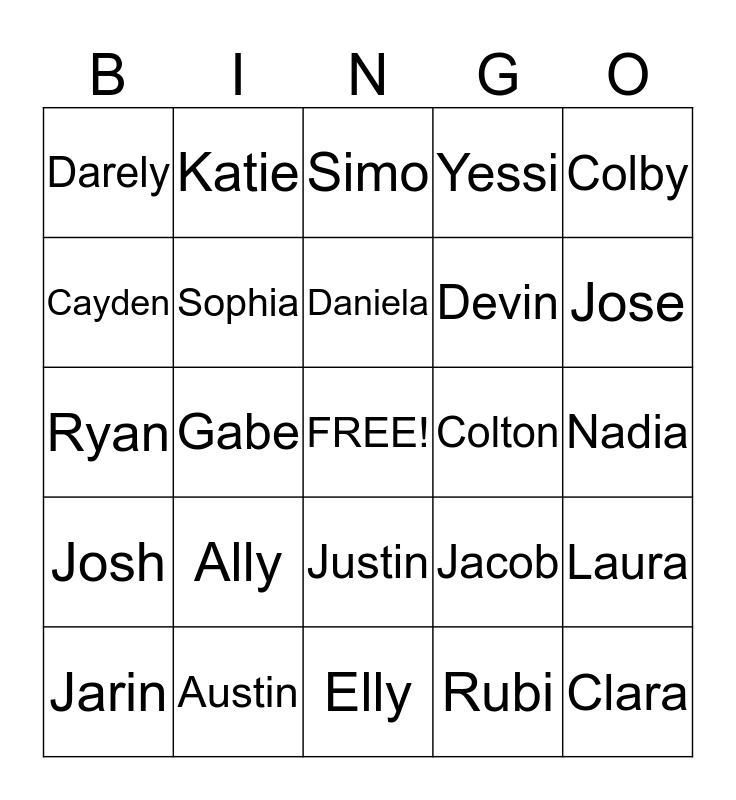 This bingo card has a free space and 24 words: Ally, Austin, Daniela, Jarin, Colby, Darely, Cayden, Katie, Colton, Justin, Devin, Ryan, Jacob, Laura, Sophia, Rubi, Nadia, Simo, Jose, Gabe, Clara, Josh, Yessi and Elly.