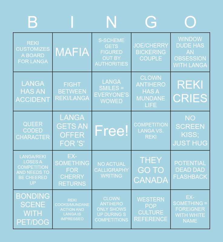 This bingo card has a free space and 35 words: DEAD DAD, FILLER MONTAGE, REKI BEING A BROTHER, FIGHT BETWEEN REKI/LANGA, NO ACTUAL CALLIGRAPHY WRITING, JOE/CHERRY BICKERING COUPLE, LANGA HAS AN ACCIDENT, "I ONLY WANT TO SKATE IF ITS WITH YOU", LANGA SMILES = EVERYONE'S WOWED, PALM TREES WILL MAKE SENSE, QUEER CODED CHARACTER, WINDOW DUDE HAS AN OBSESSION WITH LANGA, ONLY 1 FEMALE CHARACTER, A MOM WILL CRY, REKI CUSTOMIZES A BOARD FOR LANGA, COMPETITION LANGA VS. REKI, WESTERN POP CULTURE REFERENCE, LANGA GETS AN OFFER FOR 'S', LANGA/REKI LOSES A COMPETITION AND NEEDS TO BE CHEERED UP, EX-SOMETHING = FOREIGNER WITH WHITE NAME, THEY GO TO CANADA, BONDING SCENE WITH PET/DOG, POTENTIAL DEAD DAD FLASHBACK, REKI COOKS/MUNDANE ACTION AND LANGA IS IMPRESSED, S-SCHEME GETS FIGURED OUT BY AUTHORITIES, REKI CRIES, FEMALE SUITORS FOR LANGA, LANGA GETS NICKNAMED BY GILRS (PRINCE/HANDSOME/PRETTY), CLOWN ANTIHERO HAS A MUNDANE LIFE, NO SCREEN KISS; JUST HUG, NO REKI FAMILY, CLOWN ANTIHERO ONLY SHOWS UP DURING S COMPETITIONS, EX-SOMETHING FOR CHERRY RETURNS, MAFIA and CARLA IS INVOLVED AS TECH STUFF FOR CHERRY.