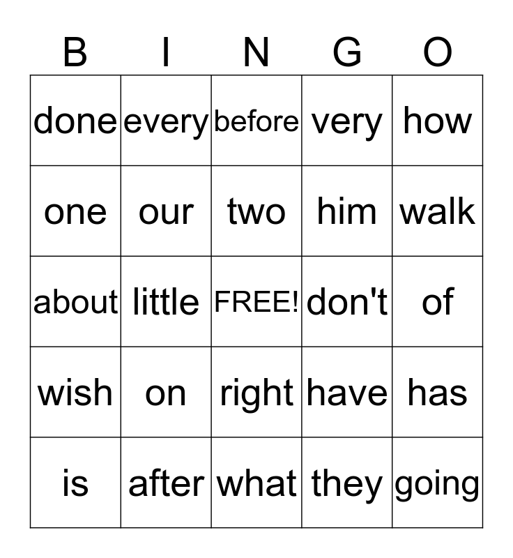 This bingo card has a free space and 50 words: always, going, may, what, on, were, every, did, one, away, our, very, has, have, my, read, two, don't, again, how, little, they, done, him, funny, pretty, walk, from, before, right, call, thank, does, first, after, hot, by, fall, green, of, an, five, me, you, is, about, would, long, wish and give.