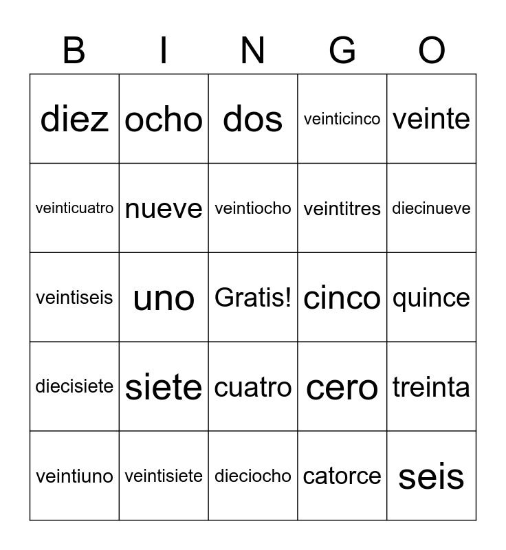 This bingo card has a free space and 31 words: dieciocho, trece, uno, dieciséis, diez, dos, nueve, cero, cinco, catorce, quince, seis, veintidos, tres, diecinueve, once, treinta, siete, diecisiete, cuatro, veinte, doce, veintiuno, ocho, veintitres, veinticuatro, veinticinco, veintiseis, veintisiete, veintiocho and veintinueve.