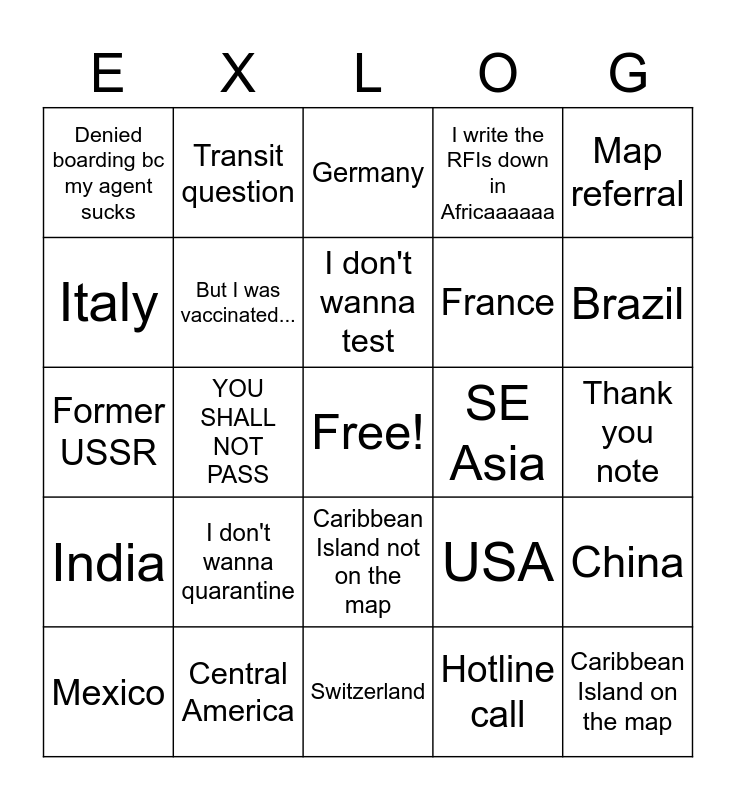This bingo card has a free space and 27 words: USA, UK, France, Switzerland, Italy, Germany, Transit question, India, SE Asia, China, Former USSR, I write the RFIs down in Africaaaaaa, Mexico, Central America, Brazil, Argentina, But I was vaccinated..., I don't wanna test, I don't wanna quarantine, Denied boarding bc my agent sucks, Thank you note, Hotline call, YOU SHALL NOT PASS, Caribbean Island on the map, Caribbean Island not on the map, Map referral and You could've Googled this.