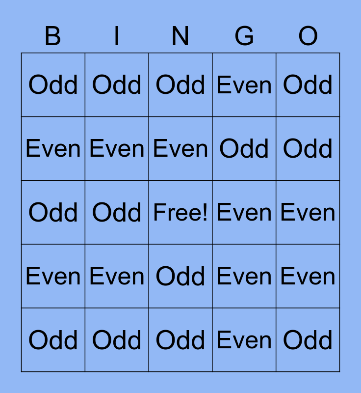 This bingo card has a free space and 24 words: Even, Odd, Even, Odd, Odd, Odd, Even, Odd, Even, Odd, Odd, Odd, Even, Even, Even, Even, Even, Odd, Odd, Odd, Odd, Even, Even and Odd.