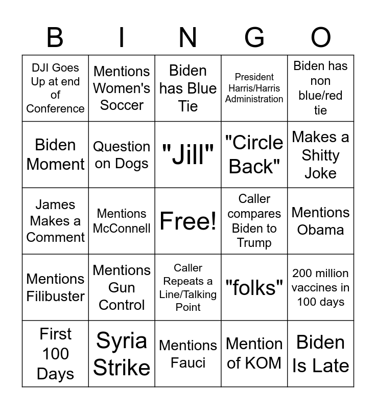 This bingo card has a free space and 34 words: Kyle yells, Blames Trump, "inherited", Bashes GOP, Mentions Obama, Biden Moment, Question on Dogs, Mentions Fauci, "Circle Back", Biden Is Late, James Makes a Comment, Mentions Women's Soccer, Mention of KOM, Biden has a mask on when he shows up, Mentions Filibuster, Mentions McConnell, Caller Repeats a Line/Talking Point, Caller compares Biden to Trump, 200 million vaccines in 100 days, First 100 Days, Syria Strike, Says Vaccination before COVID or Stimulus, President Harris/Harris Administration, Makes a Shitty Joke, Says Vaccination before COVID or Stimulus, Mentions Gun Control, Biden has Blue Tie, Biden has Red Tie, Biden has non blue/red tie, DJI Goes Up at end of Conference, DJI Goes Down at end of conference, "Jill", "folks" and Building back better.