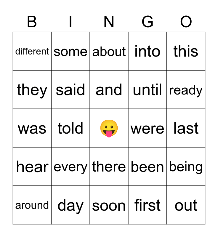 This bingo card has a free space and 24 words: every, day, and, around, this, different, they, some, were, there, until, was, been, being, said, first, last, about, ready, told, out, hear, into and soon.