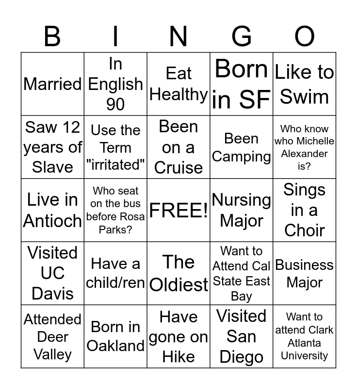 This bingo card has a free space and 24 words: Have a child/ren, Born in Oakland, Been on a Cruise, Attended Deer Valley, Like to Swim, Married, Saw 12 years of Slave, In English 90, Nursing Major, The Oldiest, Been Camping, Live in Antioch, Want to Attend Cal State East Bay, Business Major, Use the Term "irritated", Visited San Diego, Sings in a Choir, Eat Healthy, Who know who Michelle Alexander is?, Who seat on the bus before Rosa Parks?, Want to attend Clark Atlanta University, Visited UC Davis, Born in SF and Have gone on Hike.
