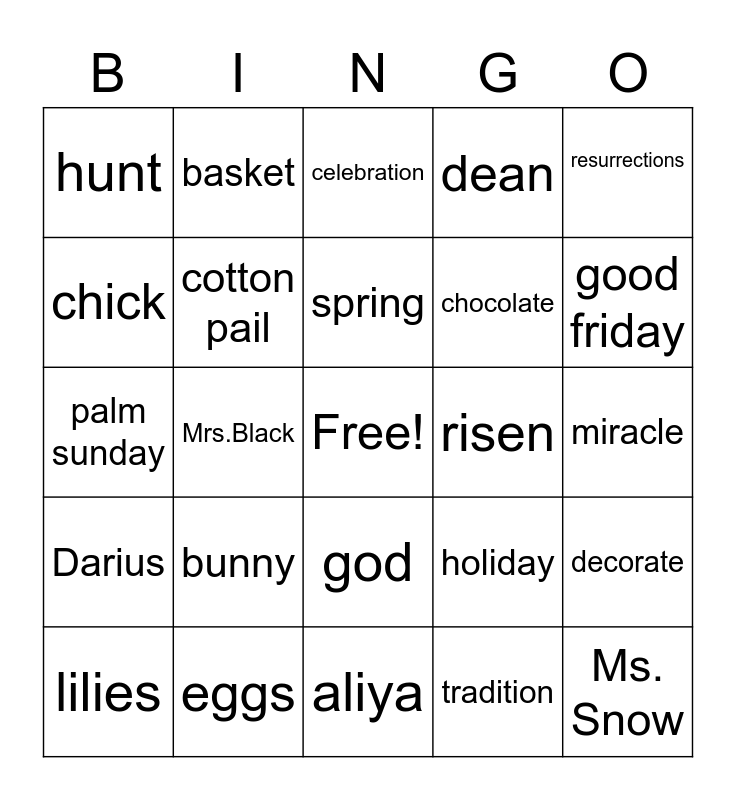 This bingo card has a free space and 24 words: bunny, eggs, spring, lilies, resurrections, hunt, chick, basket, risen, god, chocolate, palm sunday, holiday, decorate, cotton pail, tradition, miracle, celebration, good friday, Mrs.Black, Ms. Snow, Darius, dean and aliya.