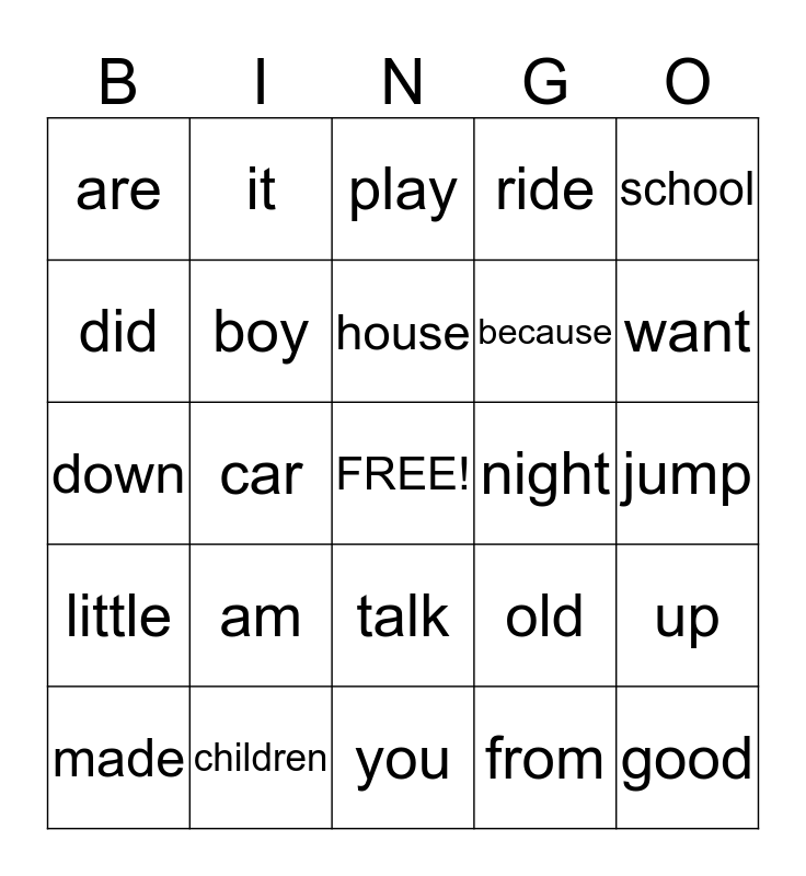 This bingo card has a free space and 24 words: am, children, house, made, school, are, did, it, night, talk, because, down, old, up, boy, from, jump, play, want, car, good, little, ride and you.