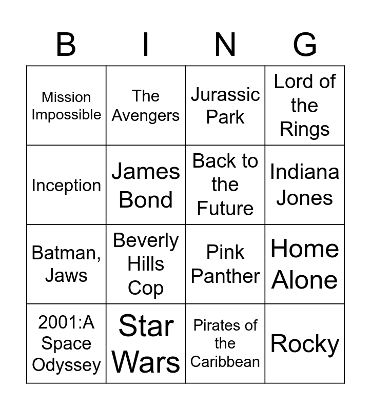 This bingo card has 21 words: Star Wars, Ghost Busters, The Avengers, Harry Potter, Pirates of the Caribbean, Back to the Future, Mission Impossible, Jurassic Park, Pink Panther, Indiana Jones, Batman, Jaws, Lord of the Rings, Rocky, Titanic, James Bond, E.T, 2001:A Space Odyssey, Beverly Hills Cop, Inception, Home Alone and Superman.