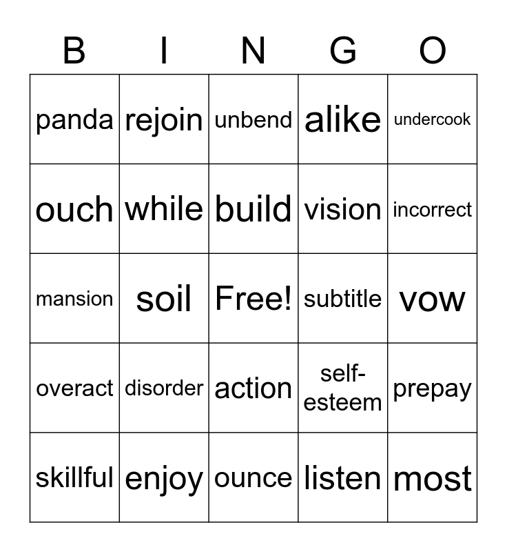 This bingo card has a free space and 29 words: skillful, hoping, soil, wild, panda, unbend, while, disorder, subtitle, enjoy, vow, most, ounce, listen, incorrect, wrist, action, overact, undercook, mansion, self-esteem, reach, vision, ouch, alike, rejoin, prepay, build and prove.