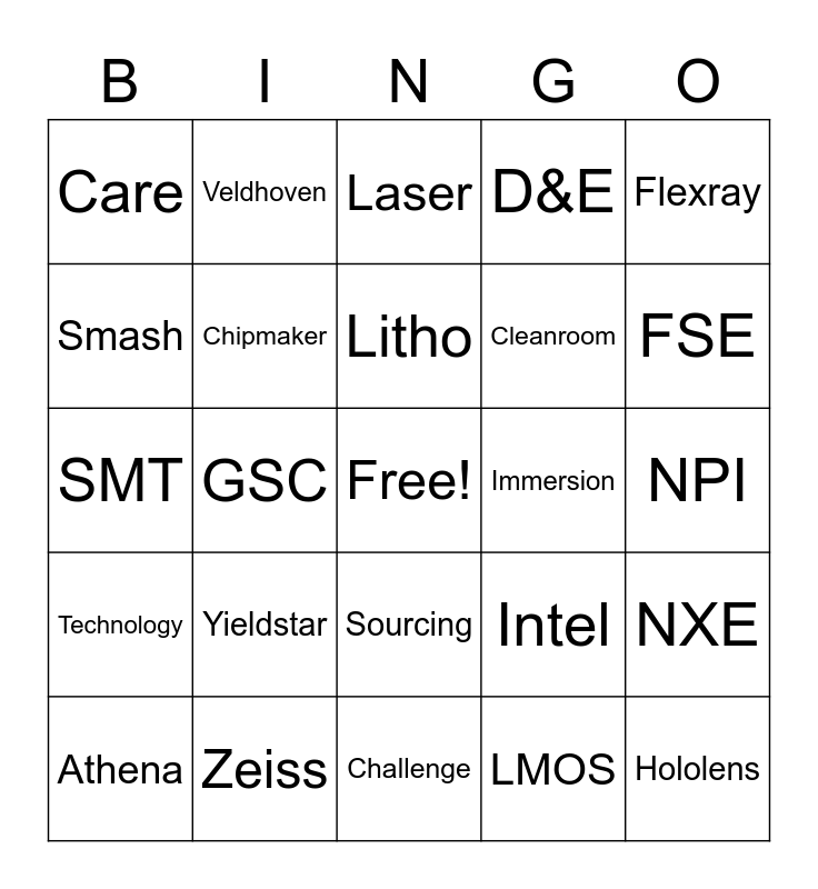 This bingo card has a free space and 55 words: ASML, Athena, Bunny Suit, Care, Challenge, Chandler, Chipmaker, Chips, Cleanroom, Collaborate, D&E, DUV, eCoach, EHS, EUV, Fab, Flexray, GSC, HMI, Hololens, Immersion, Innovation, Intel, Laser, Lens, Litho, LMOS, Metrology, NPI, NXE, NXT, ONE, R&D, Reticles, Smash, SMT, sustainability, Technology, transparency, Twinscan, Veldhoven, Vitality, Wafer Table, Wafers, Yieldstar, Zeiss, GPTW, Safety, CS, FSE, Spotfire, Inventory, MDG, Sourcing and Lean.