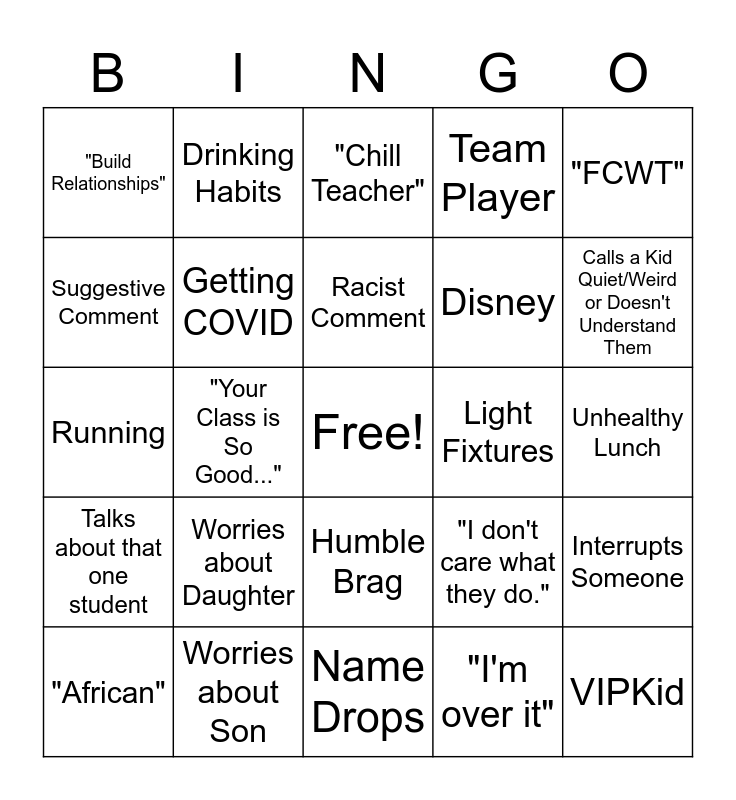 This bingo card has a free space and 24 words: Worries about Daughter, Worries about Son, Racist Comment, "African", "FCWT", "Build Relationships", Suggestive Comment, Drinking Habits, Light Fixtures, Humble Brag, Disney, Running, "I don't care what they do.", Interrupts Someone, Getting COVID, "I'm over it", Unhealthy Lunch, "Chill Teacher", Calls a Kid Quiet/Weird or Doesn't Understand Them, "Your Class is So Good...", VIPKid, Talks about that one student, Team Player and Name Drops.