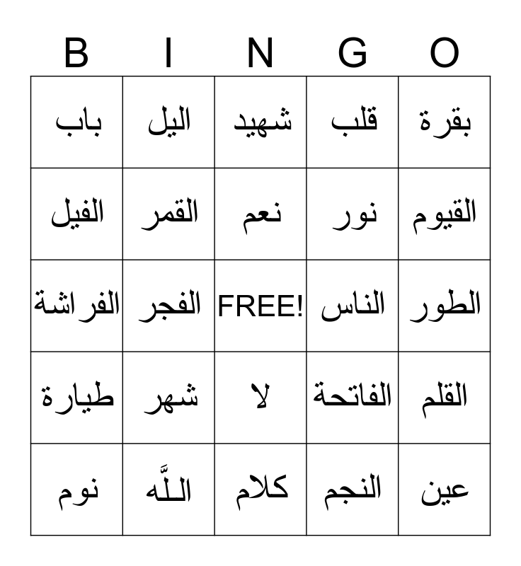 This bingo card has a free space and 24 words: شهر, الـلَّه, نعم, نوم, بقرة, باب, الفيل, اليل, الناس, لا, نور, الفراشة, الفاتحة, القلم, القمر, النجم, الطور, شهيد, القيوم, الفجر, عين, طيارة, قلب and كلام.