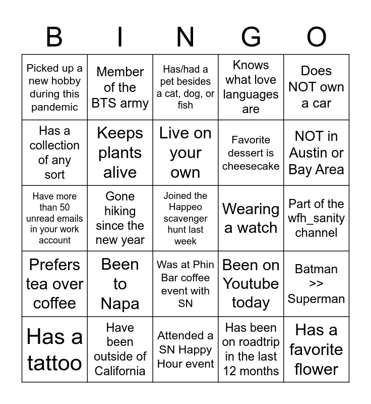 This bingo card has 30 words: Have been outside of California, Wear corrective lenses, Gone hiking since the new year, Listened to music today, Picked up a new hobby during this pandemic, Has/had a pet besides a cat, dog, or fish, Keeps plants alive, Was at Phin Bar coffee event with SN, Wearing a watch, Attended a SN Happy Hour event, Part of the wfh_sanity channel, Joined the Happeo scavenger hunt last week, Has been on roadtrip in the last 12 months, Has a favorite flower, NOT in Austin or Bay Area, Has NOT had a haircut during this pandemic, Been on Youtube today, Prefers tea over coffee, Been to Napa, Does NOT own a car, Have more than 50 unread emails in your work account, Own an android phone, Member of the BTS army, Favorite dessert is cheesecake, Has a collection of any sort, Knows what love languages are, Batman >> Superman, Has a tattoo, Live on your own and Uses an electric toothbrush.