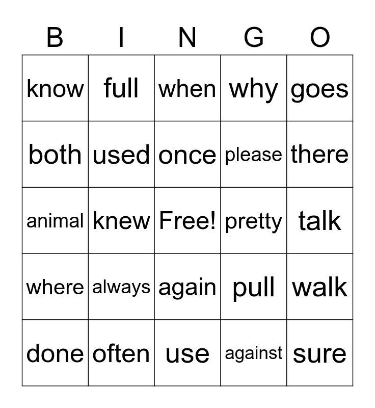 This bingo card has a free space and 24 words: always, often, once, done, goes, know, both, full, pretty, again, please, animal, pull, walk, used, against, talk, when, there, knew, sure, where, why and use.