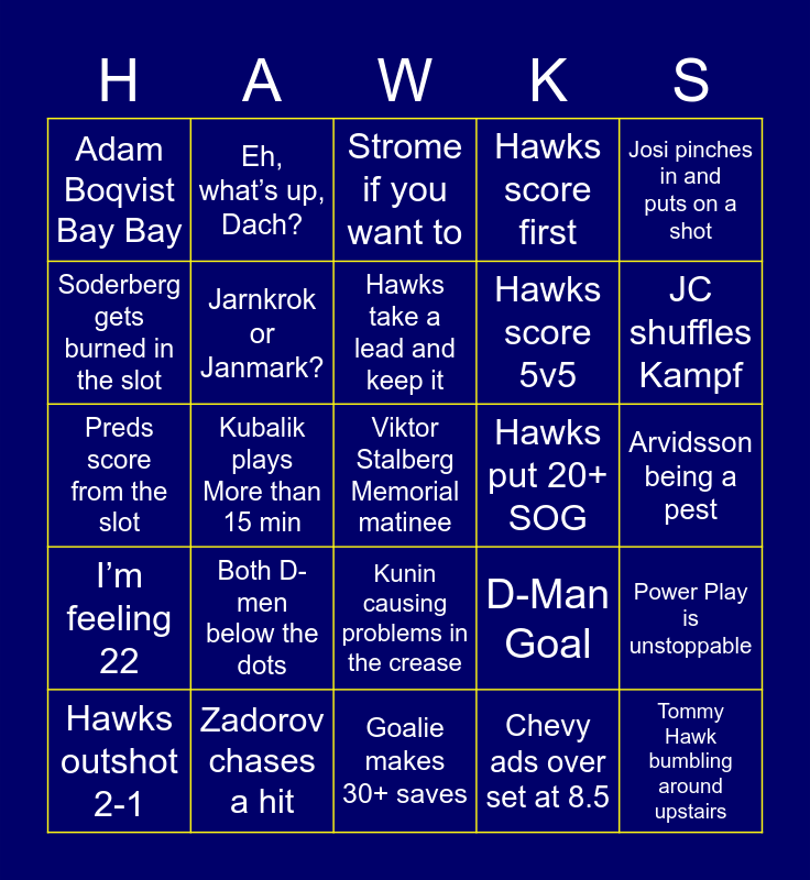 This bingo card has a free space and 24 words: Hawks outshot 2-1, Both D-men below the dots, Hawks take a lead and keep it, Chevy ads over set at 8.5, Josi pinches in and puts on a shot, Adam Boqvist Bay Bay, Eh, what’s up, Dach?, Strome if you want to, Hawks put 20+ SOG, Arvidsson being a pest, Preds score from the slot, Jarnkrok or Janmark?, D-Man Goal, Power Play is unstoppable, Soderberg gets burned in the slot, Zadorov chases a hit, Goalie makes 30+ saves, Hawks score first, JC shuffles Kampf, I’m feeling 22, Kubalik plays More than 15 min, Kunin causing problems in the crease, Hawks score 5v5 and Tommy Hawk bumbling around upstairs.
