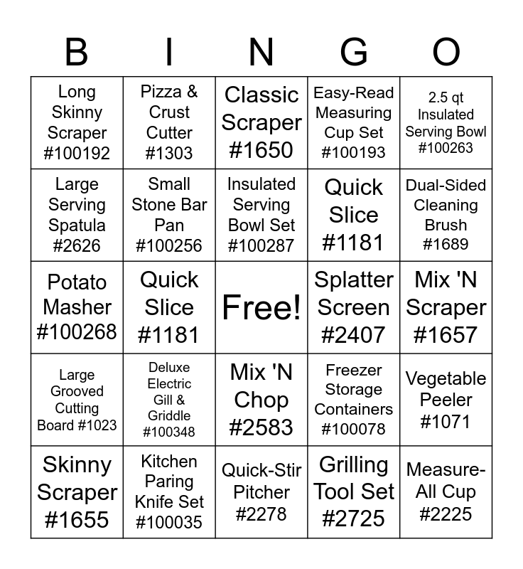 This bingo card has a free space and 105 words: 1 c. Prep Bowl Set #1825, 2.5 qt Cool & Serve Bowl #100091, 2.5 qt Insulated Serving Bowl #100263, 5-Section Tray #2618, 6-qt Enameled Dutch Oven #100249, Adjustable Measuring Spoon Set #2258, All-Purpose Spreader #1642, Baker's Roller #1485, Bamboo Spoon Set #1674, Basic Veggie Prep Set #100226, Batter Scraper #169, Burger & Slider Press #1174, Cake Tester & Releaser #1794, Ceramic Egg Cooker #1529, Chef's Silicone Basting Brush #1755, Classic Batter Bowl #2431, Classic Scraper #1650, Coated Knife Set #100157, Cookie Sheet Set #1592, Cookware Tool & Utensil Holder Set #2628, Corer #100267, Corn Butterer #2460, Deluxe Cooking Blender #100125, Deluxe Cooking Blender Smoothie Cup #100196, Deluxe Cooking Blender Smoothie Cup & Adapter #100195, Deluxe Electric Gill & Griddle #100348, Dual-Sided Cleaning Brush #1689, Easy-Read Measuring Cup Set #100193, Easy-Read Mini Measuring Cup #2177, Flexible Cutting Mat Set #1519, Freezer Storage Containers #100078, Grilling Tool Set #2725, Half Sheet Pan & Baking Rack Set #100104, Handy Scraper #1615, Hot Pad & Trivet #100200, Ice Cream Scoop #100264, Ice Cream Spade #100113, Instant-Read Food Thermometer #100121, Insulated Serving Bowl Set #100287, Kitchen Paring Knife Set #100035, Large Chef's Tongs #2955, Large Grooved Cutting Board #1023, Large Scoop #1790, Large Serving Spatula #2626, Large Sheet Pan #1771, Long Skinny Scraper #100192, Measure, Mix & amp;Pour #100190, Measure-All Cup #2225, Measuring Cup Set #2257, Measuring Spoon Set #2308, Medium Scoop #2540, Mesh Produce Bags #100363, Microwave Bowl Cozy Set #100055, Microwave Pasta Cooker #2633, Mini Measure-All & Tbsp; Cup #2236, Mini Mix N Scraper #1656, Mini Nylon Serving Spatula #2438, Mini Serving Spatula #2622, Mini Skinny Scraper #1704, Mix 'N Chop #2583, Mix 'N Scraper #1657, Nylon Knife #1169, Nylon Turner #2011, Pasta Tongs #100359, Pastry Blender #1686, Pastry Mat #1718, Petite Measure-All Cup #2268, Pizza & Crust Cutter #1303, Potato Masher #100268, Quick Slice #1181, Quick-Stir Pitcher #2278, Salad Cutting Bowl #100086, Scoop & Serve Spatula #100286, Scoop & Spread #1708, Scoop 'N Drain #1622, Silicone & Wood Utensil Set #100219, Silicone Oven Mitt Set #100198, Silicone Prep Bowl Set #1751, Skinny Scraper #1655, Small Batter Bowl #2432, Small Mix 'N Scraper #1659, Small Scoop #2530, Small Spreader #2071, Small Stone Bar Pan #100256, Smooth-Edge Can Opener #2759, Splatter Screen #2407, Stackable Cooling Rack Set #1588, Stainless Steel Mini Whipper #2635, Stainless Steel Bowl Set #1735, Stainless Steel Rotating Utensil Holder #2013, Stainless Steel Whisk #2475, Stone Bar Pan #100384, Toaster Tongs #2571, Twixit! Clip set #2651, Vegetable Peeler #1071, Wine Essential Tools #1798, Wood Cutting Board #1591, Manual Food Processor #2593, Quick Slice #1181, Ceramic Egg Cooker #1529, Quick Shred #100122, Garlic Peeler & Slicer Set #2578, Microwave Popcorn Maker #1457, Citrus Juicer & Zester #100361 and Soft Pretzel-Making Set #100087.