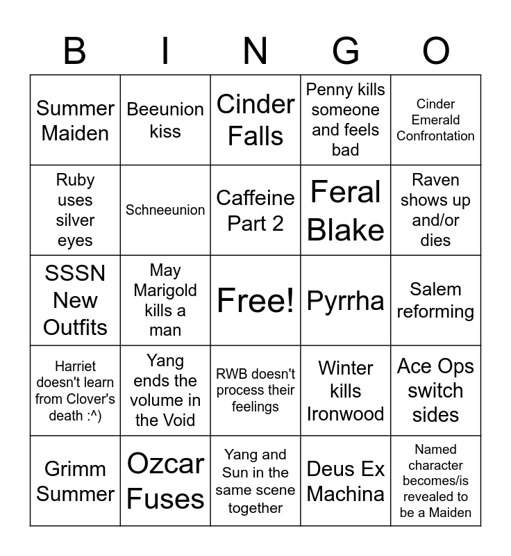 This bingo card has a free space and 24 words: Yang ends the volume in the Void, Ozcar Fuses, Caffeine Part 2, Grimm Summer, Cinder Emerald Confrontation, Summer Maiden, Ruby uses silver eyes, Beeunion kiss, Pyrrha, RWB doesn't process their feelings, Feral Blake, SSSN New Outfits, Winter kills Ironwood, Ace Ops switch sides, Schneeunion, Deus Ex Machina, Salem reforming, Cinder Falls, Raven shows up and/or dies, May Marigold kills a man, Named character becomes/is revealed to be a Maiden, Harriet doesn't learn from Clover's death :^), Penny kills someone and feels bad and Yang and Sun in the same scene together.