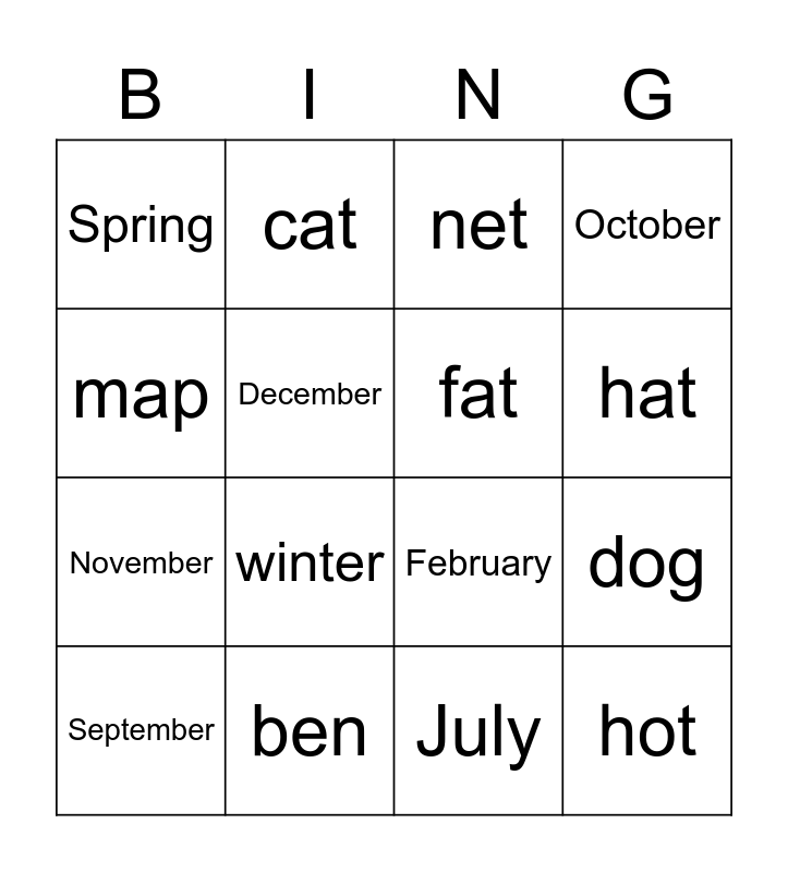 This bingo card has 32 words: sap, zap, dog, vic, hot, fat, map, bog, cat, mel, hat, net, vet, ten, ben, kev, January, February, March, April, May, June, July, August, September, October, November, December, Spring, autumn, summer and winter.