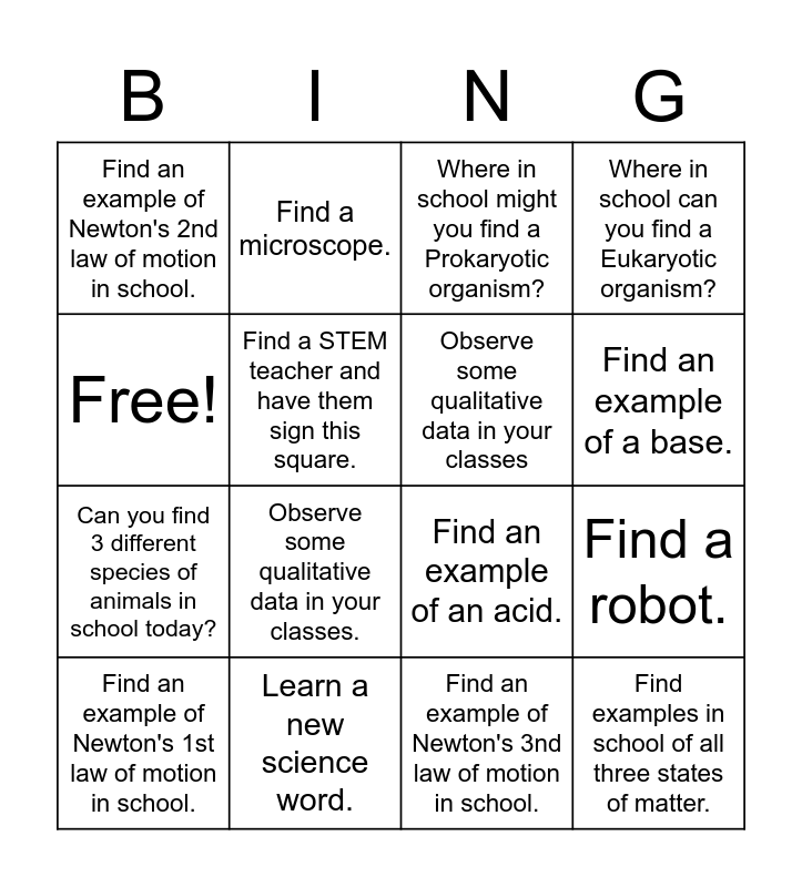 This bingo card has 16 words: Learn a new science word., Find a robot., Where in school might you find a Prokaryotic organism?, Find an example of Newton's 2nd law of motion in school., Can you find 3 different species of animals in school today?, Find a microscope., Find an example of an acid., Find an example of Newton's 3nd law of motion in school., Free!, Find a STEM teacher and have them sign this square., Find an example of Newton's 1st law of motion in school., Where in school can you find a Eukaryotic organism?, Observe some qualitative data in your classes., Find an example of a base., Observe some qualitative data in your classes and Find examples in school of all three states of matter..