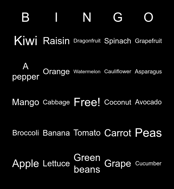 This bingo card has a free space and 24 words: Apple, Banana, Watermelon, Grape, Grapefruit, Kiwi, Raisin, Dragonfruit, Coconut, Avocado, Mango, Orange, Carrot, Peas, A pepper, Lettuce, Green beans, Spinach, Asparagus, Broccoli, Cabbage, Tomato, Cauliflower and Cucumber.