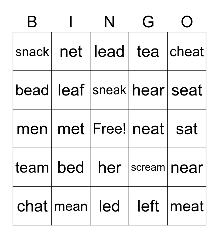 This bingo card has a free space and 24 words: bed, mean, sneak, chat, cheat, snack, bead, net, neat, her, hear, men, scream, near, leaf, left, sat, lead, seat, met, meat, team, tea and led.