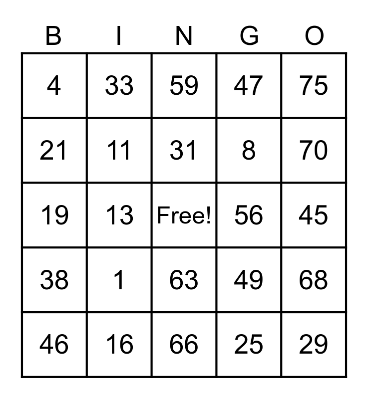 This bingo card has a free space and 24 words: 1, 16, 31, 46, 75, 4, 21, 33, 56, 63, 8, 19, 49, 68, 11, 25, 45, 59, 70, 13, 29, 38, 47 and 66.