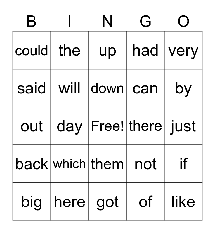 This bingo card has a free space and 24 words: which, here, down, big, very, could, said, the, there, them, can, out, not, if, will, of, just, up, by, day, like, back, had and got.
