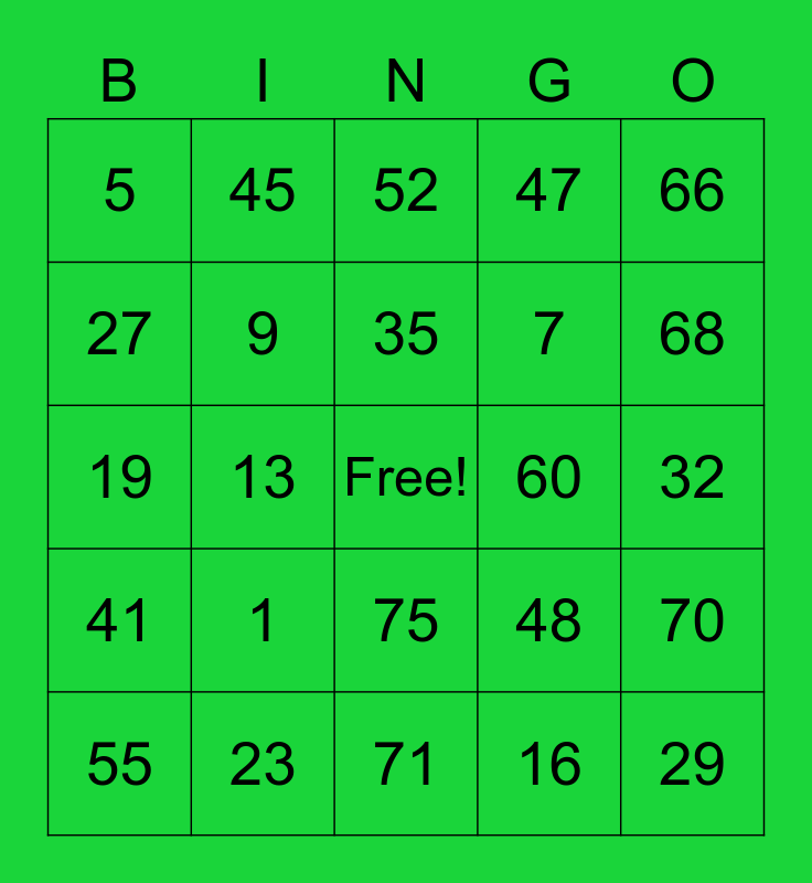 This bingo card has a free space and 24 words: 1, 23, 35, 55, 66, 5, 27, 45, 60, 75, 7, 19, 48, 70, 9, 16, 32, 52, 68, 13, 29, 41, 47 and 71.
