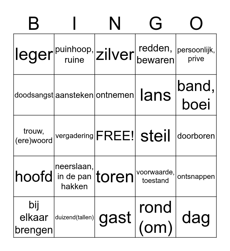 This bingo card has a free space and 31 words: gast, vrede, vergadering, gooien, werpen, leger, zilver, aansteken, voorwaarde, toestand, steil, rond (om), doorboren, dag, moeras, ontbreken (aan), band, boei, opvallend, ontsnappen, neerslaan, in de pan hakken, hoofd, toren, persoonlijk, prive, brengen naar, bij elkaar brengen, puinhoop, ruine, lans, doodsangst, redden, bewaren, trouw, (ere)woord, duizend(tallen), ontnemen and weggaan, naar buiten gaan.
