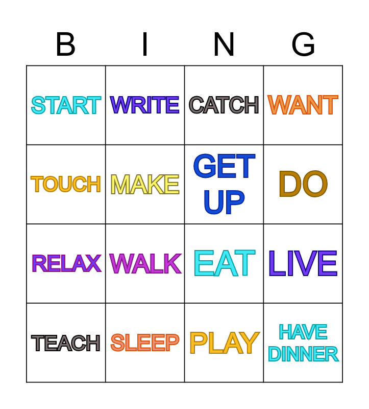 This bingo card has 32 words: READ, STUDY, LIVE, WATCH, HAVE DINNER, GET UP, TOUCH, KISS, WRITE, LIKE, DO, CATCH, GO, FINISH, SLEEP, WASH, LOVE, EAT, DRINK, FLY, WORK, LISTEN, PLAY, STAY, TEACH, WANT, RELAX, MAKE, START, GET DRESSED, COME and WALK.