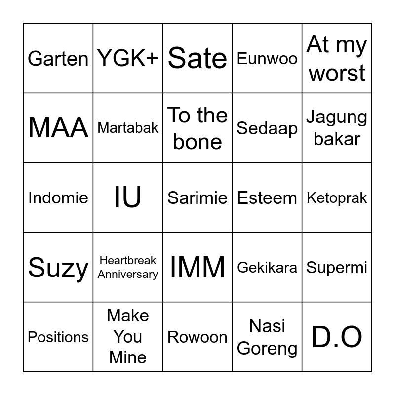 This bingo card has a free space and 24 words: Heartbreak Anniversary, Make You Mine, To the bone, Positions, At my worst, Garten, MAA, YGK+, Esteem, IMM, Sedaap, Indomie, Gekikara, Supermi, Martabak, Nasi Goreng, Ketoprak, Sate, Jagung bakar, IU, D.O, Suzy, Eunwoo and Rowoon.