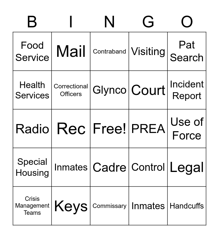 This bingo card has a free space and 29 words: Crisis Management Teams, Annual Training, Rec, Recidivism, Food Service, Contraband, Correctional Officers, Inmates, PREA, Keys, Use of Force, Handcuffs, Commissary, Inmates, Incident Report, Vest, Cadre, Special Housing, Pat Search, Radio, Control, OC Spray, Court, Health Services, Visiting, Mail, Legal, Glynco and Uniforms.