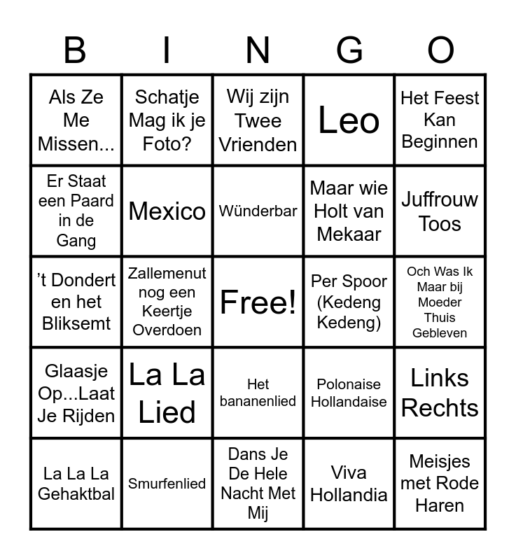 This bingo card has a free space and 66 words: Zak es lekker door, Bloemetjesgordijn, Mama, woar is mien pils, Links Rechts, Liever te Dik in de Kist, Toeter op mijn Waterscooter, Schatje Mag ik je Foto?, Helikopter, Wünderbar, 's Nachts Na Tweeën, Het bananenlied, De vogeltjesdans, Och Was Ik Maar bij Moeder Thuis Gebleven, Het Feest Kan Beginnen, Zullen we maar weer, Er Staat een Paard in de Gang, Zallemenut nog een Keertje Overdoen, Als Ze Me Missen..., Brabantse Nachten zijn Lang, Maar wie Holt van Mekaar, La La Lied, Glaasje Op...Laat Je Rijden, Leo, Willempie, De Sambaballensamba, Bij Ons Staat Op De Keukendeur, Uche Uche Uche, Ik Wil Met Jou Wel Zeven Weken, Meisjes met Rode Haren, Unne Spijker in Munne Kop, La La La Gehaktbal, Wat Zullen we Drinken, Seks Met Die Kale, Anton aus Tirol, Polonaise Hollandaise, Smurfenlied, Boten Anna, ’t Dondert en het Bliksemt, Viva Hollandia, ’t Kleine Café aan de Haven, Mexico, Heb Je Even Voor Mij, Per Spoor (Kedeng Kedeng), Bestel Mar, Wasmasjien, Kabouterdans, Juffrouw Toos, De Hypnotiseur, Ik Heb Hele Grote Bloemkoole, He Kom Aan, Slavenkoor, Ik Hou Van Alle Vrouwen, Hemelbed Polka, Toppertje, Muggen Hier, Muggen Daar, Hey Suzie, Atje voor de Sfeer, Ik krijg een Heel Apart Gevoel van Binnen, Wij zijn Twee Vrienden, Dans Je De Hele Nacht Met Mij, Marianneke, Zak Es Lekker Door, Wat Zullen We Drinken, Kleine Jodeljongen, Den Uyl Is In Den Olie and Jan Klaassen De Trompetter.