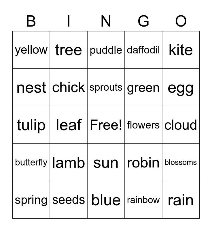 This bingo card has a free space and 29 words: spring, buds, leaf, bunny, yellow, puddle, chick, lamb, flowers, seeds, cloud, rain, blue, rainbow, egg, frog, sun, butterfly, kite, tulip, robin, ladybug, green, nest, daffodil, tree, blossoms, sprouts and umbrella.