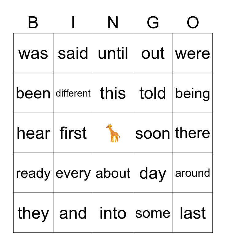 This bingo card has a free space and 24 words: every, and, this, they, were, was, been, said, soon, about, told, hear, day, around, different, some, there, until, being, first, last, ready, out and into.