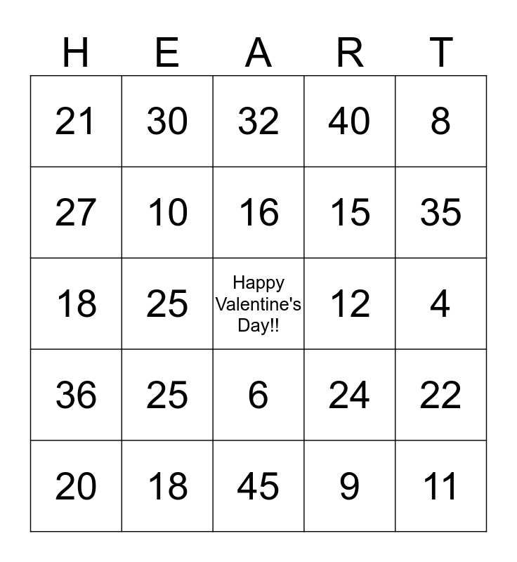 This bingo card has a free space and 24 words: 25, 18, 16, 20, 8, 21, 27, 30, 12, 6, 15, 18, 24, 22, 10, 9, 4, 32, 35, 25, 11, 36, 40 and 45.
