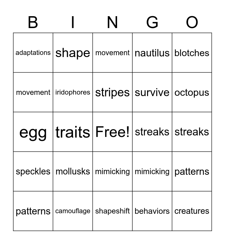 This bingo card has a free space and 52 words: cuttlefish, creatures, brainy, shapeshift, mollusks, color, shape, texture, movement, chromatophores, iridophores, leucophores, patterns, mimicking, tentacles, camouflage, stripes, streaks, speckles, blotches, traits, behaviors, adaptations, survive, thrive, ocean, environment, mollusks, octopus, cuttlefish, squid, nautilus, color, shape, texture, movement, camouflage, chromatophores, iridophores, leucophores, stripes, streaks, speckles, blotches, mimicking, tentacles, rainbow, egg, incredible, brain, patterns and pigment.