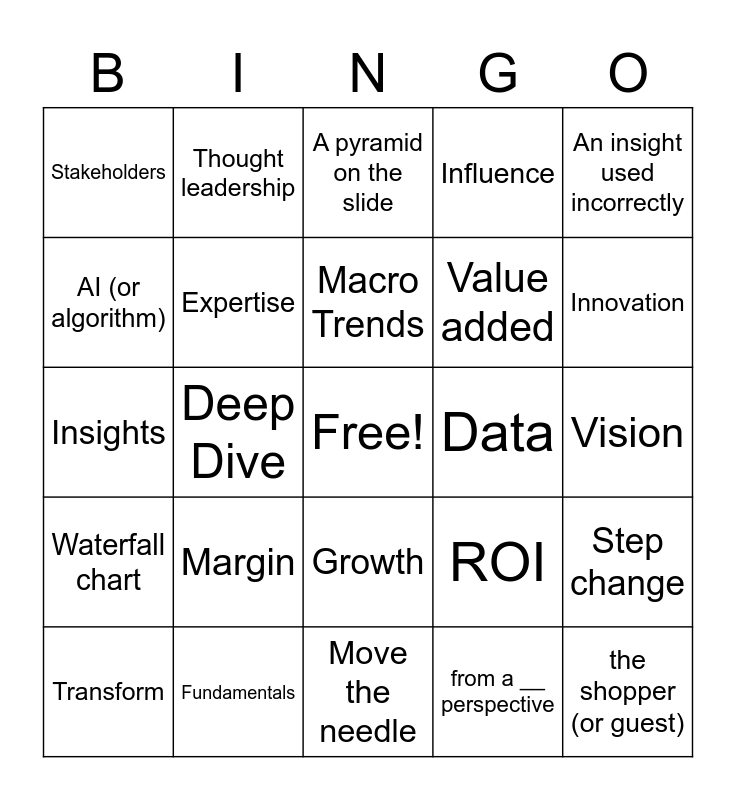 This bingo card has a free space and 24 words: Margin, Fundamentals, Macro Trends, Transform, An insight used incorrectly, Stakeholders, AI (or algorithm), Thought leadership, Data, Growth, Value added, Insights, ROI, Step change, Expertise, from a __ perspective, Vision, A pyramid on the slide, Innovation, Deep Dive, the shopper (or guest), Waterfall chart, Influence and Move the needle.