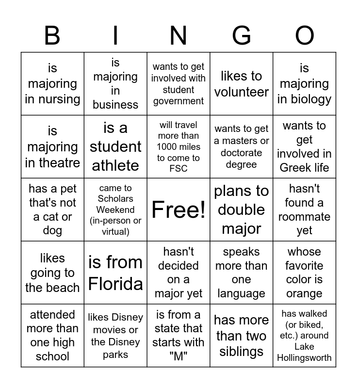 This bingo card has a free space and 25 words: is from Florida, is from a state that starts with "M", will travel more than 1000 miles to come to FSC, attended more than one high school, is majoring in biology, is majoring in nursing, is majoring in theatre, is majoring in business, plans to double major, hasn't decided on a major yet, wants to get a masters or doctorate degree, has a pet that's not a cat or dog, speaks more than one language, whose favorite color is orange, is a student athlete, has already committed to FSC, hasn't found a roommate yet, wants to get involved with student government, wants to get involved in Greek life, came to Scholars Weekend (in-person or virtual), has walked (or biked, etc.) around Lake Hollingsworth, likes Disney movies or the Disney parks, likes going to the beach, likes to volunteer and has more than two siblings.