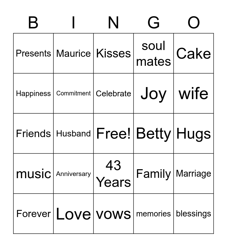 This bingo card has a free space and 24 words: Anniversary, Love, Celebrate, Forever, Cake, Presents, Happiness, Maurice, Betty, 43 Years, Joy, Friends, Family, Marriage, Commitment, memories, Hugs, Kisses, wife, Husband, blessings, music, soul mates and vows.