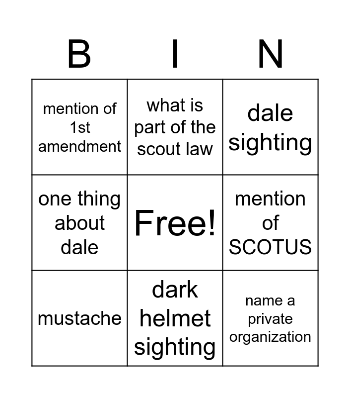 This bingo card has a free space and 8 words: mention of SCOTUS, dale sighting, what is part of the scout law, mustache, mention of 1st amendment, name a private organization, one thing about dale and dark helmet sighting.