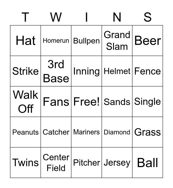 This bingo card has a free space and 49 words: Bat, Ball, Base, Pitcher, Catcher, 1st Base, Homerun, Foul Ball, Strike, 2nd Base, 3rd Base, Grand Slam, Grass, Diamond, Dodgers, Out, Inning, Sands, Hot Dogs, Beer, Fans, Jersey, Hat, Helmet, Glove, Fence, Twins, TCS Stadium, Mariners, Peanuts, Pirates, Rangers, Royals, Bases Loaded, Center Field, Batting Average, Double, Triple, Single, Farm Team, Fast Ball, Stolen Base, Slider, No Hitter, Walk Off, Bullpen, Champion, Double Header and Win.