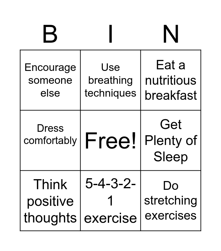 This bingo card has a free space and 8 words: Get Plenty of Sleep, Eat a nutritious breakfast, Use breathing techniques, Think positive thoughts, Encourage someone else, Do stretching exercises, Dress comfortably and 5-4-3-2-1 exercise.