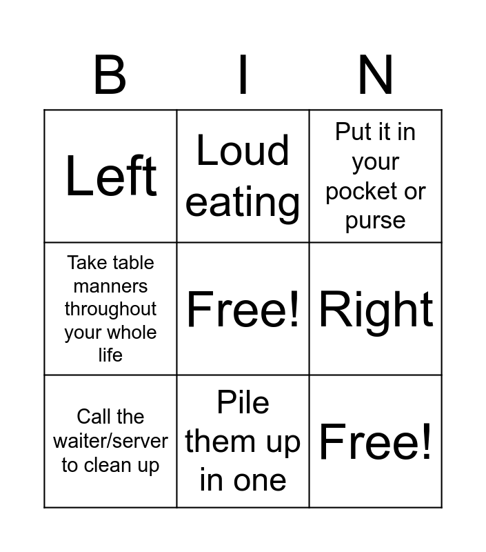 This bingo card has a free space and 8 words: Right, Put it in your pocket or purse, Loud eating, Call the waiter/server to clean up, Left, Free!, Take table manners throughout your whole life and Pile them up in one.