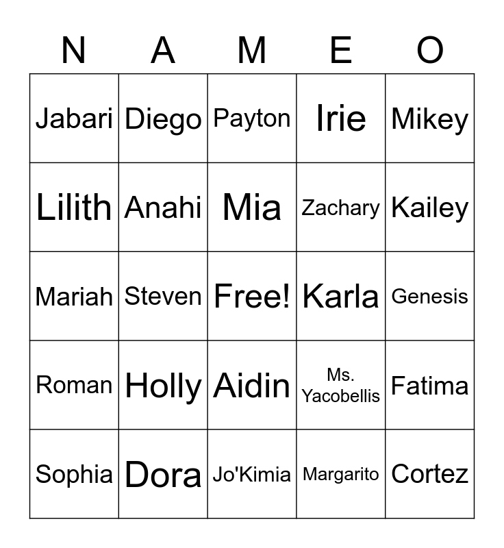 This bingo card has a free space and 24 words: Holly, Dora, Mia, Sophia, Mikey, Jabari, Lilith, Diego, Karla, Aidin, Zachary, Mariah, Ms. Yacobellis, Fatima, Anahi, Margarito, Genesis, Payton, Kailey, Steven, Cortez, Roman, Irie and Jo'Kimia.