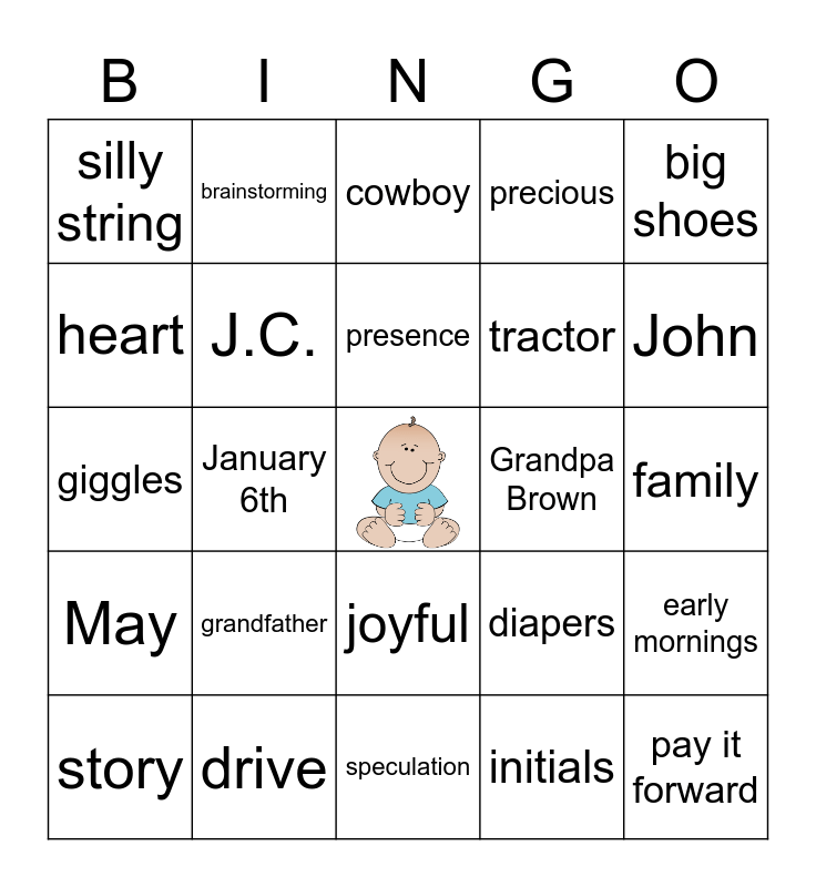 This bingo card has a free space and 29 words: story, baby boy, January 6th, blue, silly string, cowboy, J.C., grandfather, Grandpa Brown, drive, family, pay it forward, speculation, initials, John, Caldwell, joyful, May, big shoes, giggles, diapers, snuggles, tractor, heart, precious, brainstorming, early mornings, presence and popped.